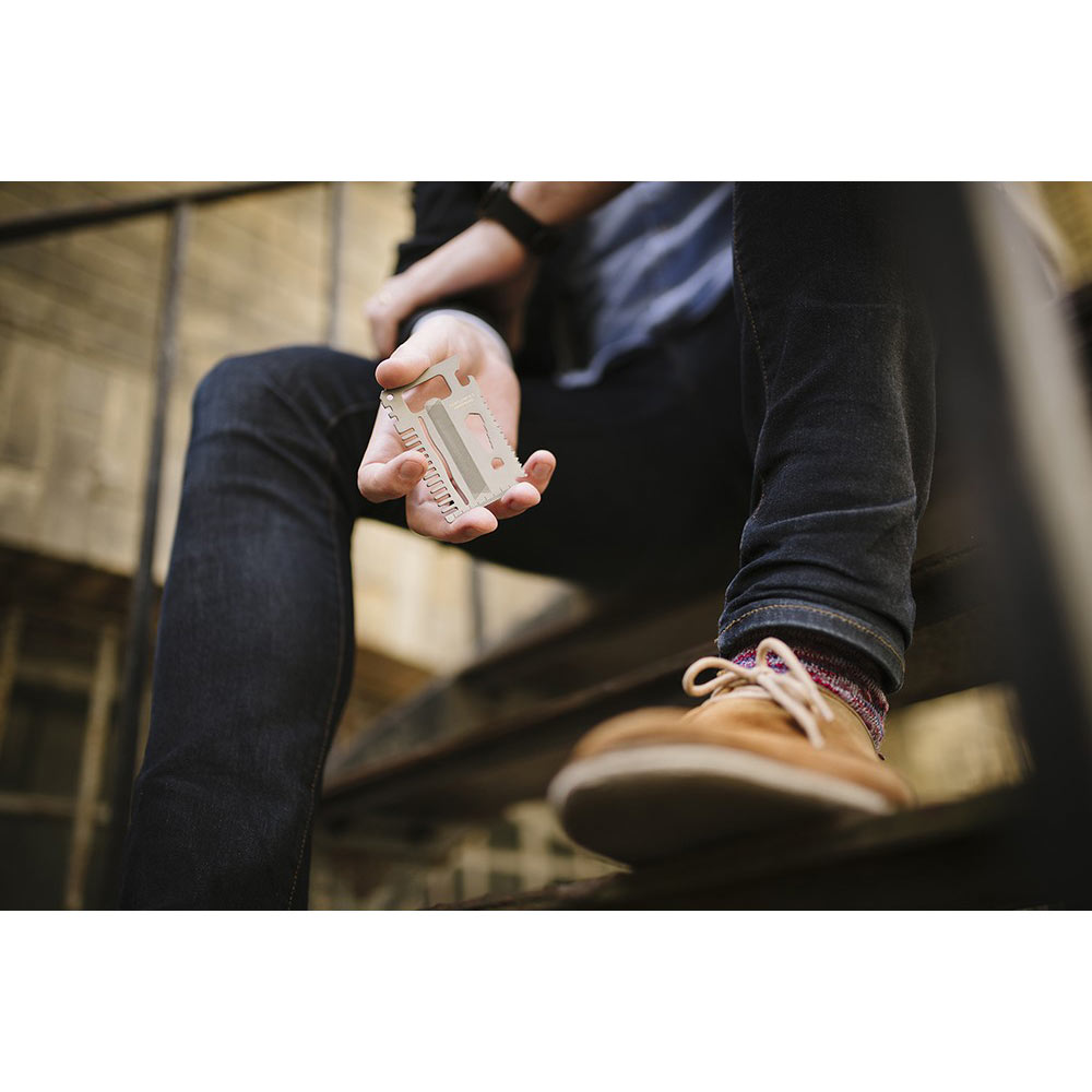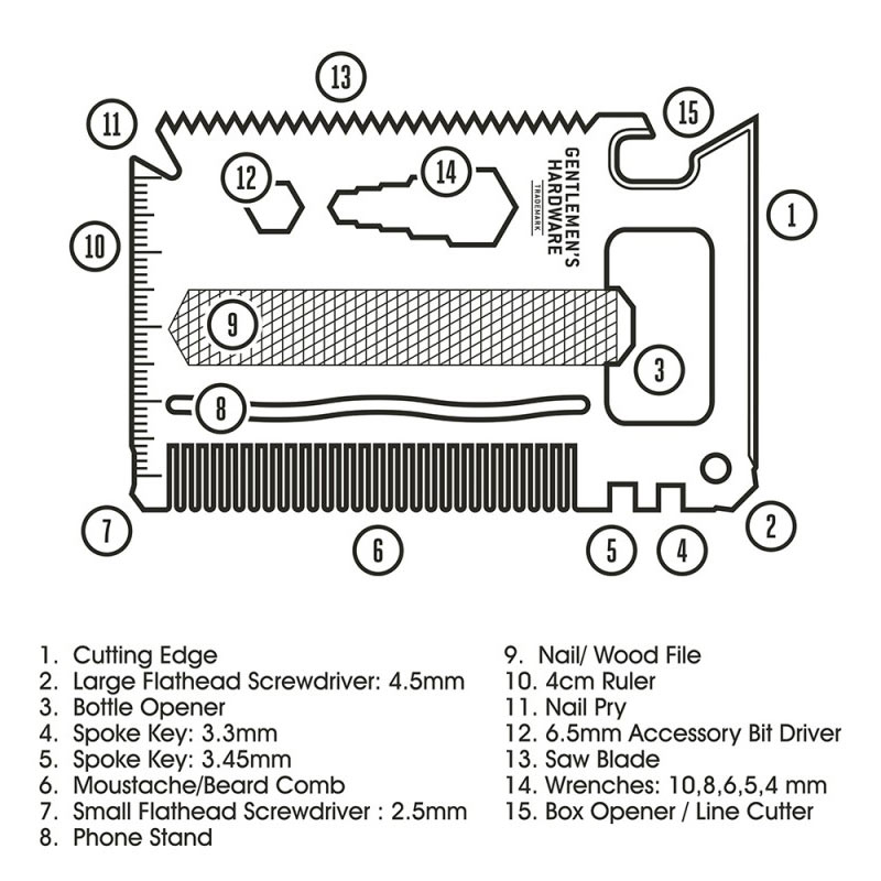 Izjemno vsestranski, kakovostno izdelan multifunkcionalni orodje ponuja kar 14 različnih funkcij, in ker je velikosti kreditne kartice, se prilega v vsako denarnico in je vedno pri roki. Na njem najdete: