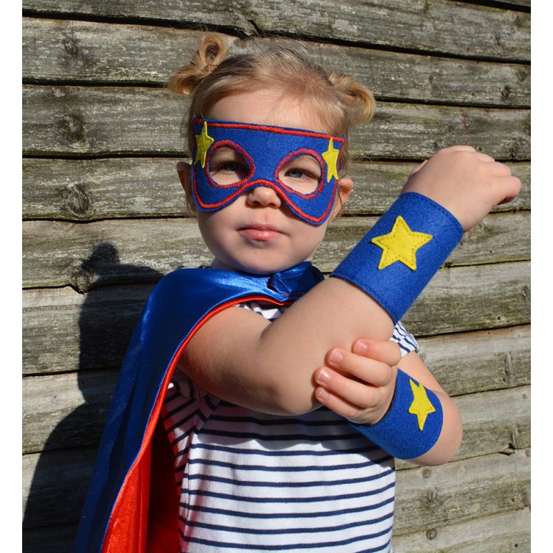 V kompletu prejmete masko in plašč, ki odlično zakrijeta pravi identiteti junaka, zapestnike, osebno izkaznico junaka in zabavne nalepke.